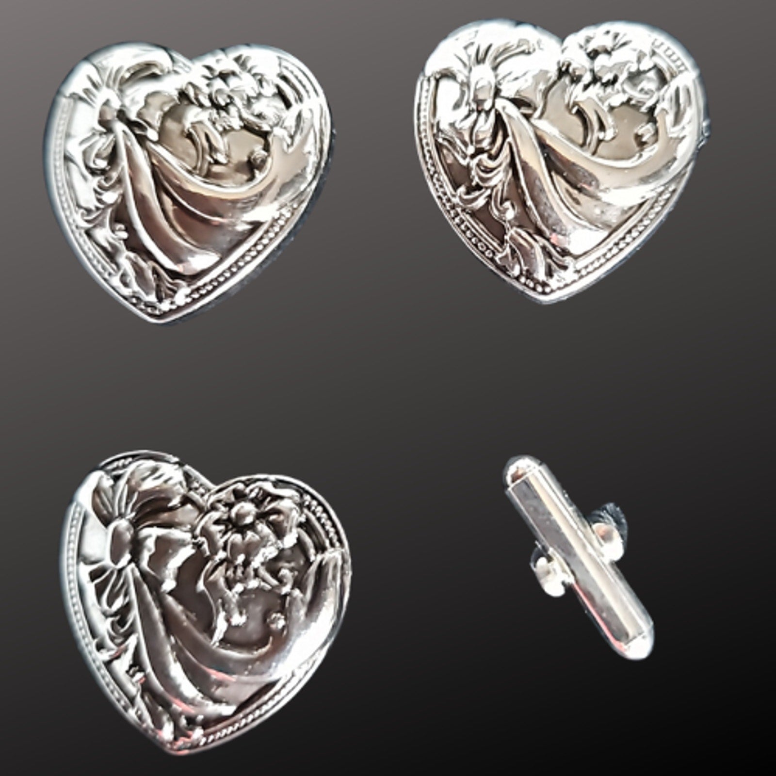 This set is Heart String. Wear your heart on your blanket! Pretty silver heart shaped pins, simply lovely. Each set includes 4 pins.