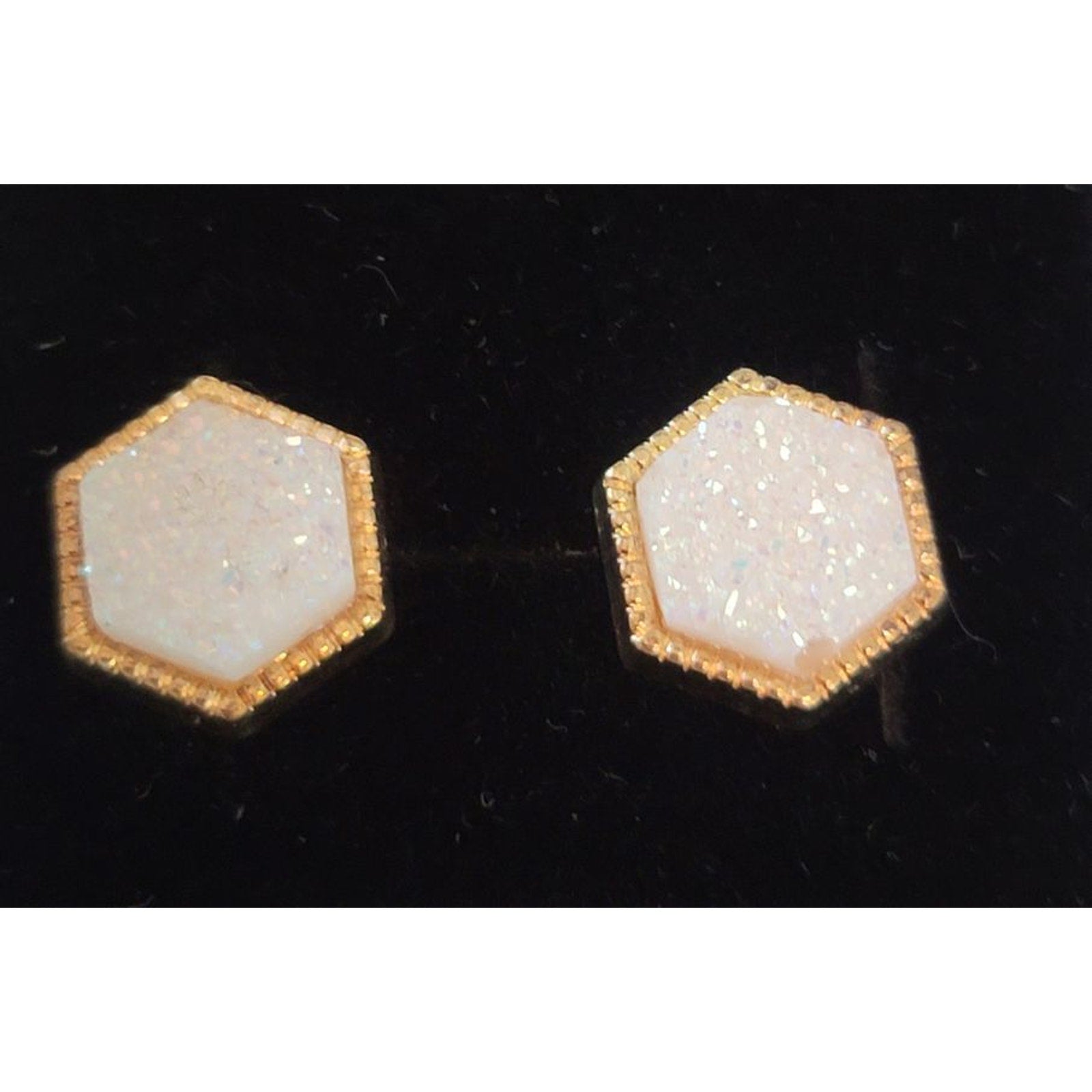 White Druzy Earrings Post Back Gold Framed Hexagon NEW