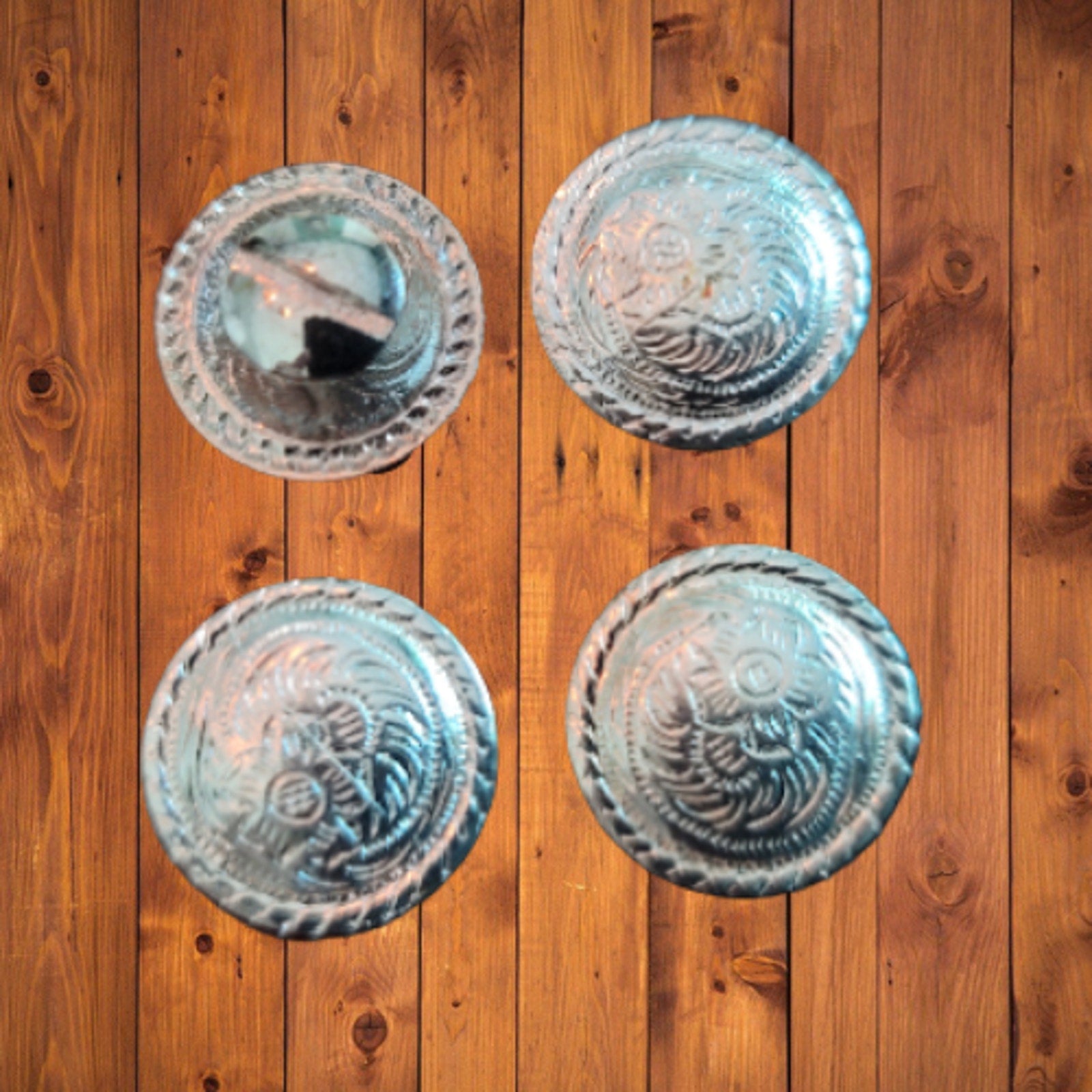 Silver plated conchos - set of 4. Approx 3/4" across. Includes chicago screw back.