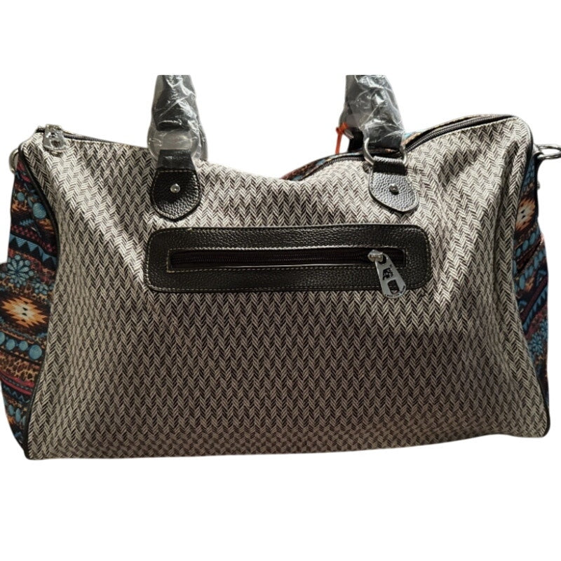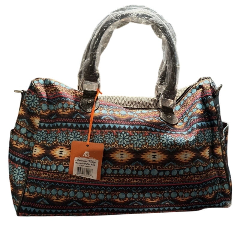 Howdy, Partner! Get ready to ride off into the sunset with this fabulous American Bling Weekender Bag! This duffle is the perfect blend of Southwestern charm and modern functionality. Ideal for a weekend getaway or a stylish trip to the gym. This bag is sure to turn heads and spark conversations. In teal, cream, and browns.