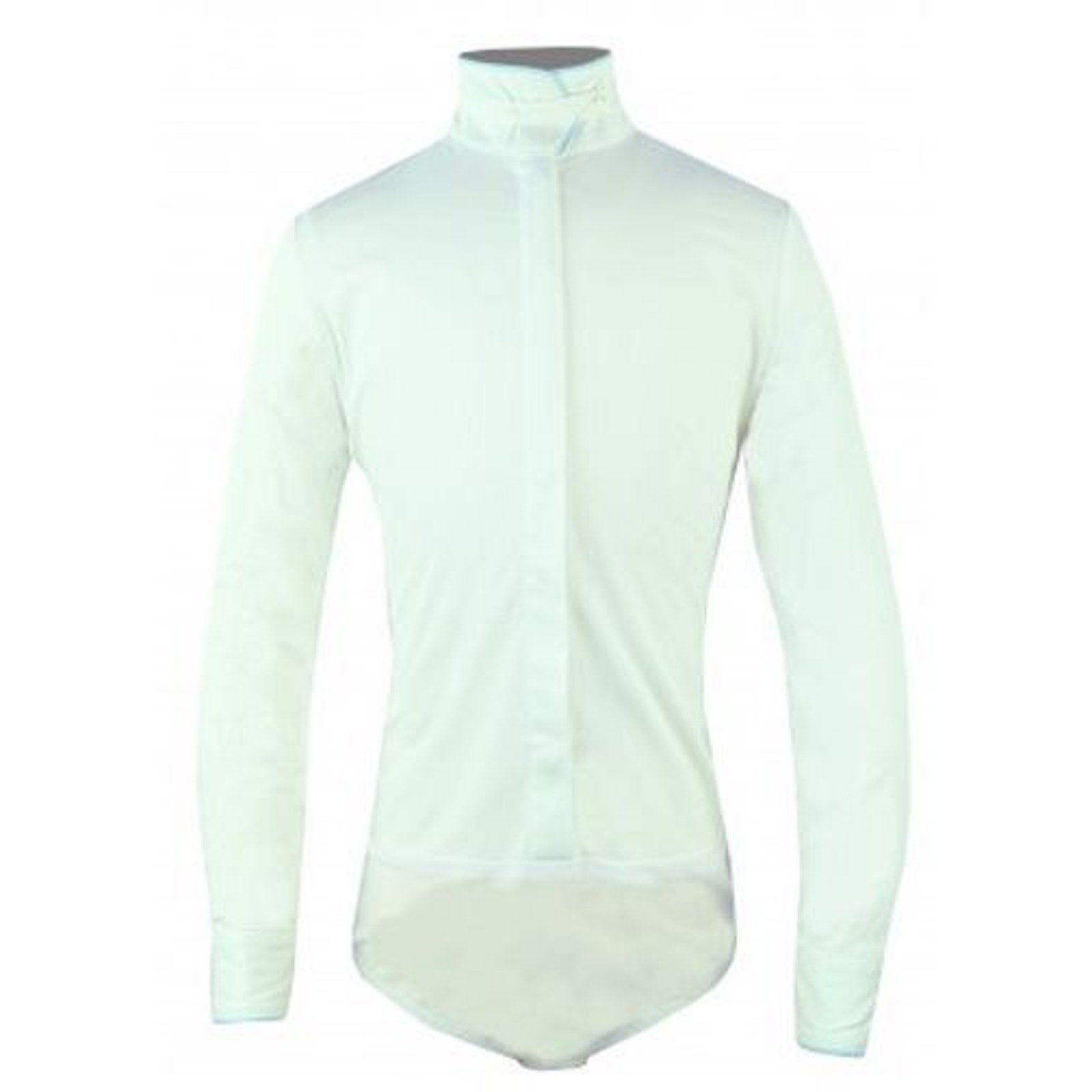 Bodysuit Show Shirt - crisp white cotton pique shirt with contrasting blue piping. Durable snap closures on sleeves and body. Button tab collar. Full panty with high front snap closure. 97%cotton, 3% spandex (body), 95% poly, 5% spandex mesh (panty) Machine Wash