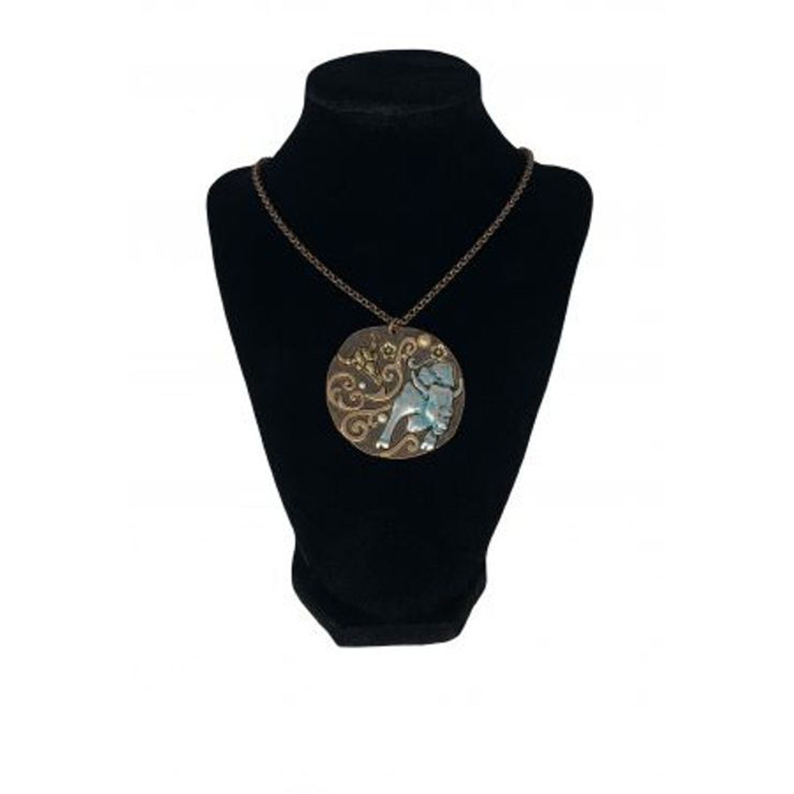 Copper colored Chain Necklace with Silver Running Bison and turquoise accents. This round copper colored pendant features a running Bison with scroll accent. Measures Approx 27" Long.