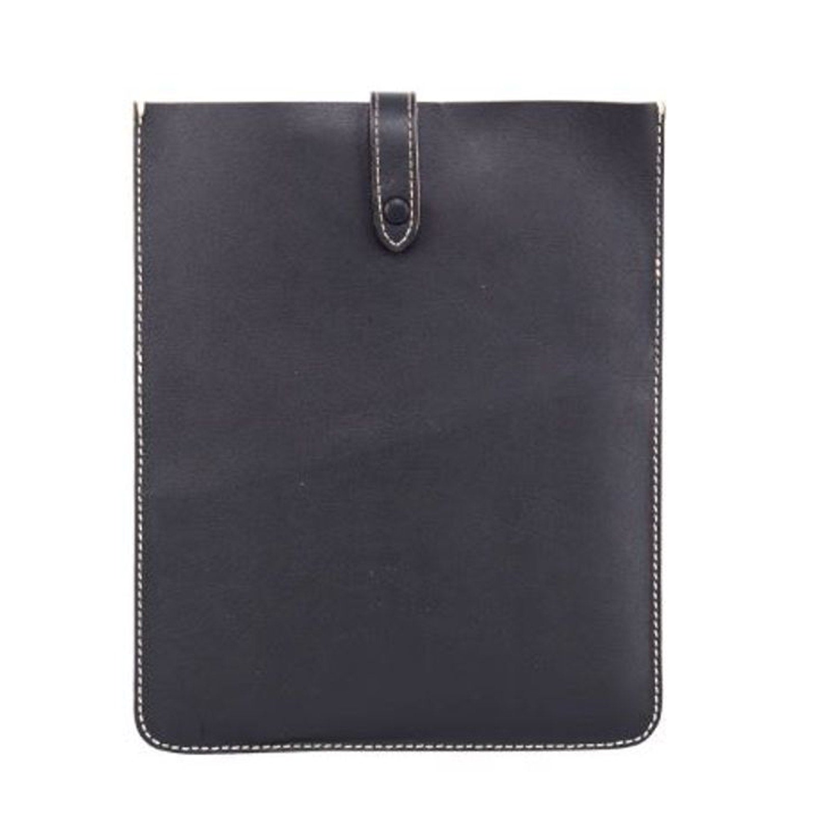 Genuine leather tablet sleeve. Button closure. Open pocket on the front. Black. As genuine leather this will have and gain with use, marks, scratches, and scars with lighter or darker shading
