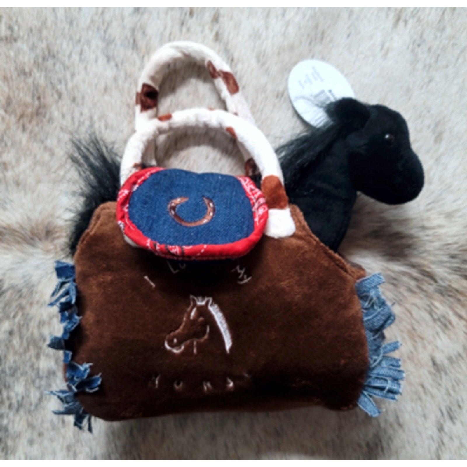 Super cute! This fun plush purse comes with a plush pony that resides inside the purse. Leave it in to carry around or take it out for play. Purse is embroidered with "I Love My Horse" with a horse head. This purse is brown plush with a black pony and a denim velcro closure. Cowhide plush handles. Denim fringe add the perfect touch!