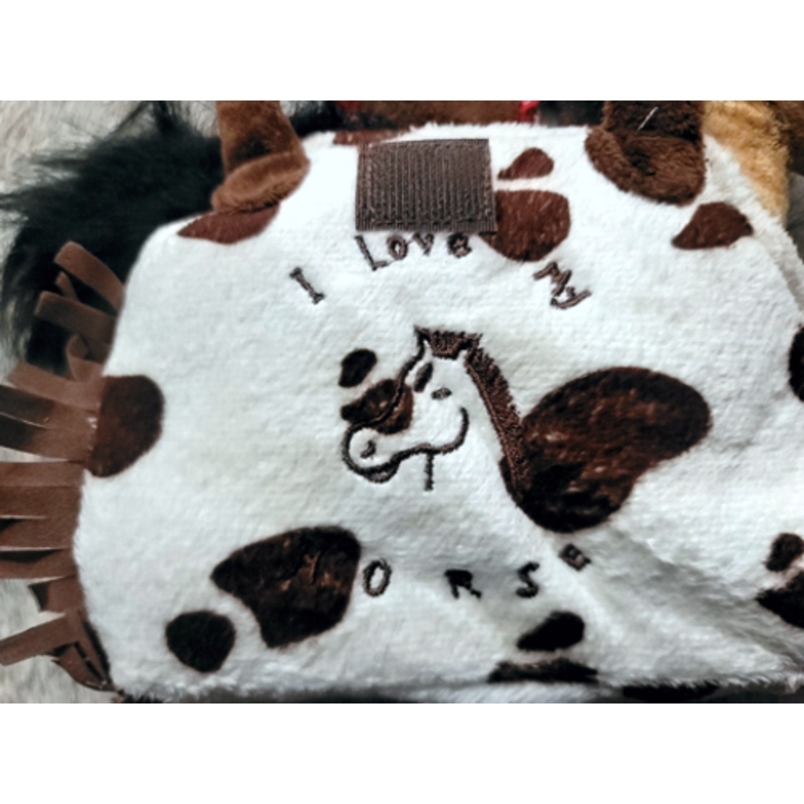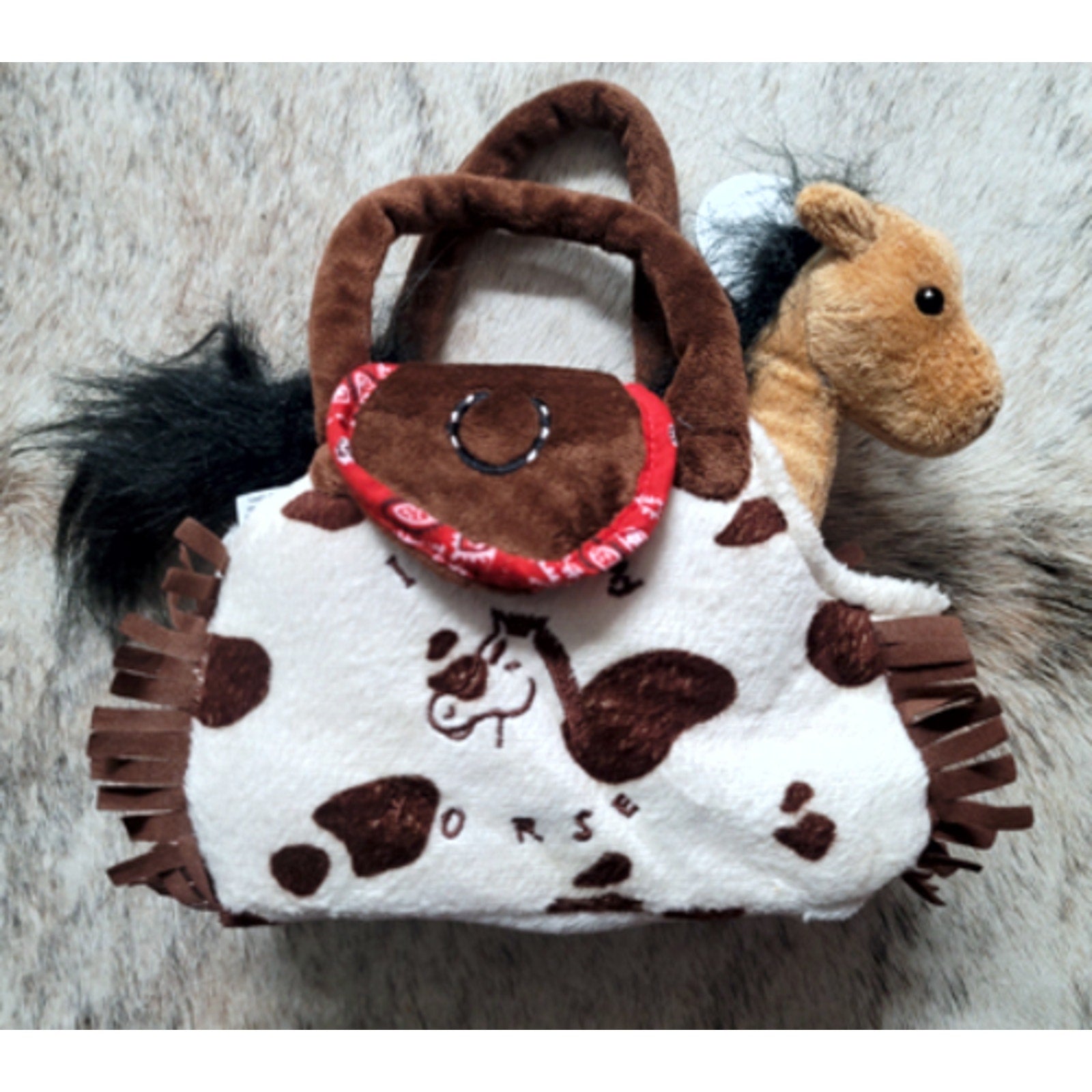 Super cute! This fun plush purse comes with a plush pony that resides inside the purse. Leave it in to carry around or take it out for play. Purse is embroidered with "I Love My Horse" with a horse head. This purse is cow print plush with a buckskin pony and a brown plush velcro closure. Brown plush handles. Fringe add the perfect touch!