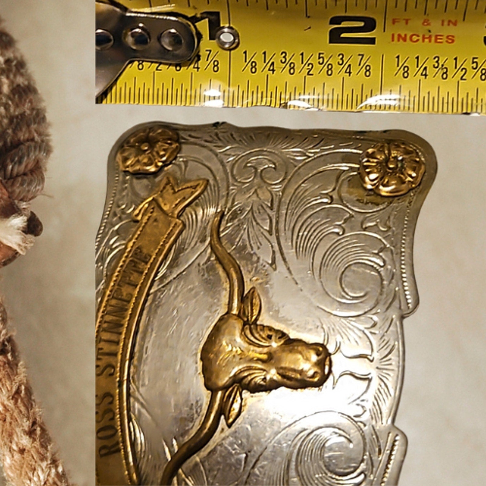 Great used buckle by Rockmount out of Denver, CO. Engraved "Ross Stinnette" on the sash in jewelers bronze along with corner rosettes. See pictures for dimensions.
