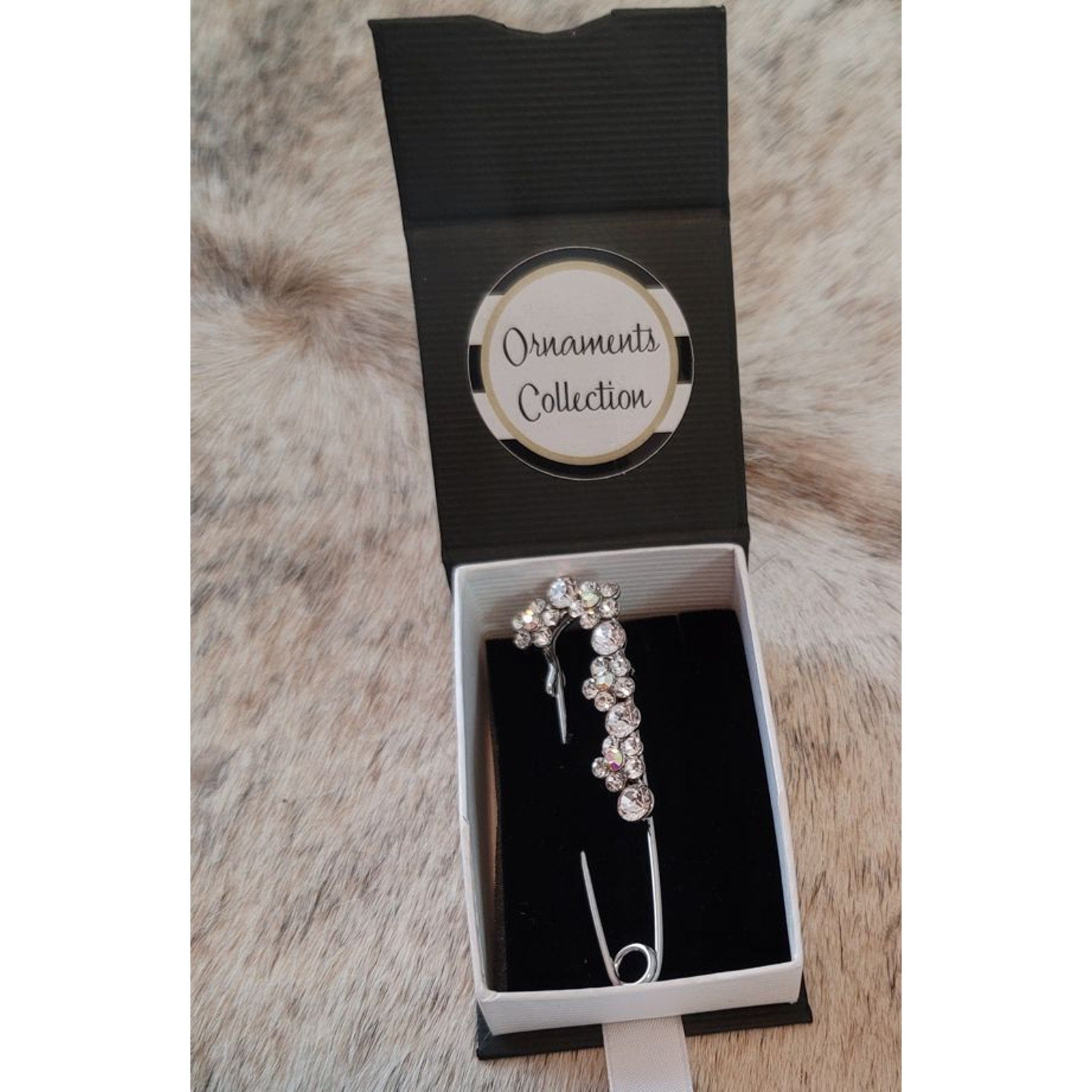 Beautful SIlver Stock Pin or Brooch. This pin is stunning! Crystals run around the pin. Approx 3" across. Comes in a beautiful unique ribboned magnetic closure gift box.