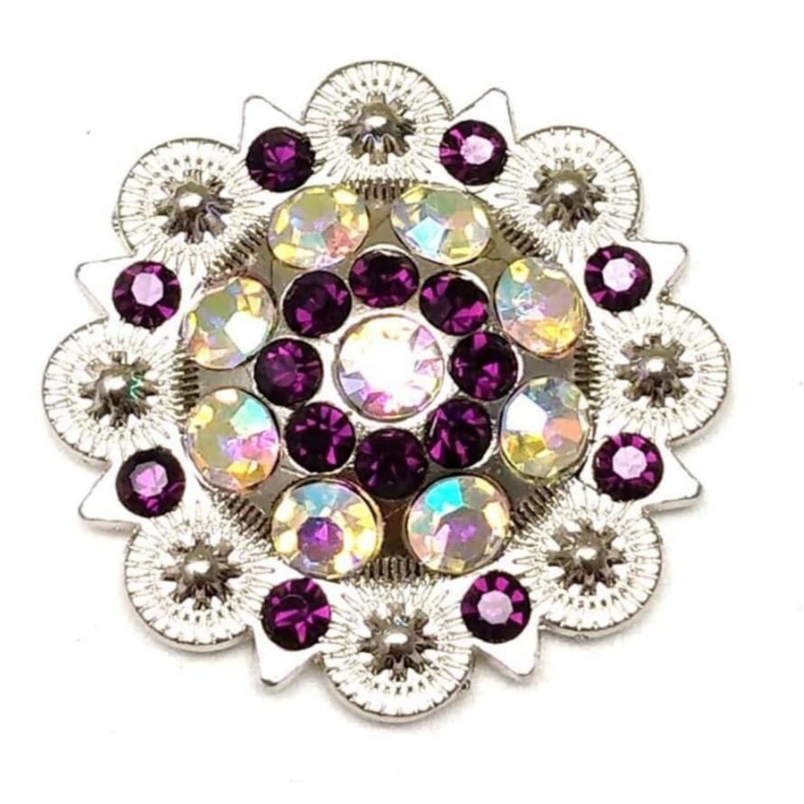 Purple or burgundy and clear crystals on a silver concho make this a very versatile piece. Sometimes the crystals look purple, sometimes burgundy. You could wear this with just about anything and look smashing!