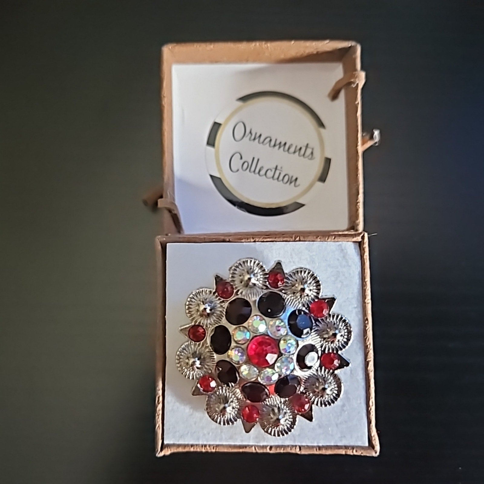 Red, black, and clear crystals on a silver concho make this a very versatile piece. Use with a plain or patterned scarf and wrap your way to a win!