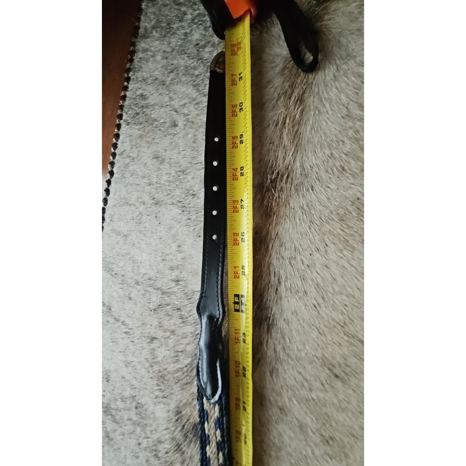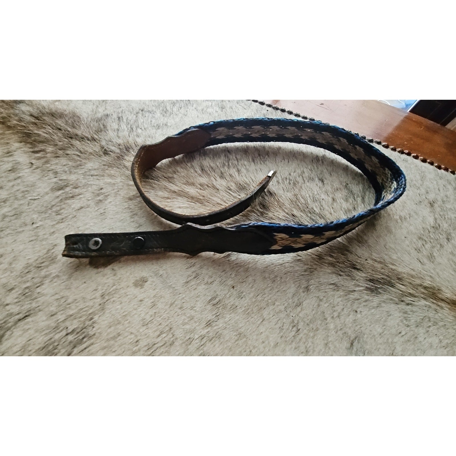 Nice used youth belt - approximately 26" to 29" long. Black with blue and cream hitched poly/nylon.